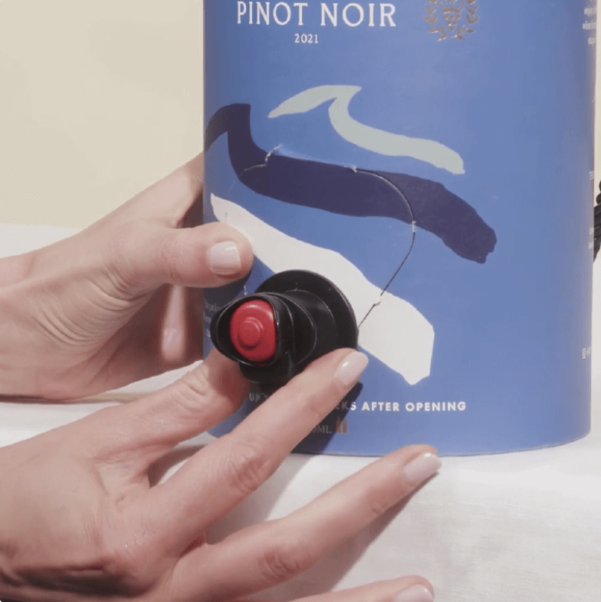 Remove the foil from the tap and press down on the red button to pour. Enjoy your delicious wine for up to 6 weeks after opening!